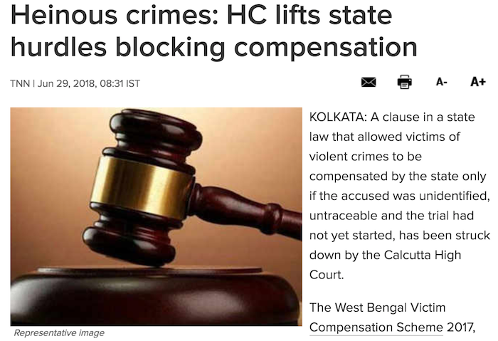 The West Bengal Victim Compensation Scheme 2017, formulated after the Centre amended the CrPC, compensates victims for heinous offences like acid attacks, rapes, murders, and even for causing the loss of a foetus or fertility.