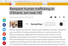 Taking a strict stand on ‘rampant human trafficking in the state’, Uttarakhand high court (HC) on Thursday asked police officials to “invoke provisions of the Money Laundering Act, 2008 against the persons who are involved in human trafficking, and also attach their properties.” The division bench of justices Rajiv Sharma and Alok Singh while hearing an appeal against acquittal of a man who was charged with trafficking a girl from Nepal. also asked the state government to “carry out a verification of children, particularly minor girls and women coming to India from Nepal and counsel them properly.”