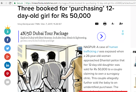 NAGPUR: A case of human trafficking was exposed when a 26-year-old woman approached Dhantoli police that her 12-day-old daughter was sold for Rs 50,000 to a couple claiming to own a surrogacy clinic. This couple allegedly further sold the baby to an unidentified purchaser. The couple has been arrested and granted two days PCR, but the baby is yet to be traced. A woman agent involved in the deal too has been booked, but is yet to be arrested.