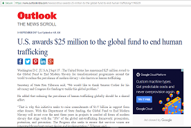 The United States has announced an award of $25 million to the Global Fund to End Modern Day Slavery for transformational programmes around the world to reduce the prevalence of modern day slavery- also known as human trafficking.