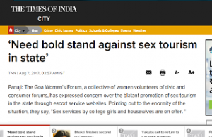 Goa is increasingly becoming a dominant hub for sex tourism, following in the footsteps of Thailand and the Philippines. Raising concern over this the Goa Collective forum, a group of women volunteers of civic and consumer forums, has appealed business and state bodies such as Goa Chamber of Commerce and Industry (GCCI), Confederation of Indian Industry (CII) and the Shack Owners Welfare Society of Goa to take a stringent stand against the promotion of sex tourism in the state.